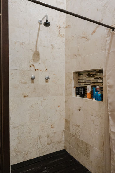 2 Full bathrooms; one bath is shared between the first and second bedrooms, and one bath is private off the third bedroom. Both have showers, private bath has a deep soaking tub.
